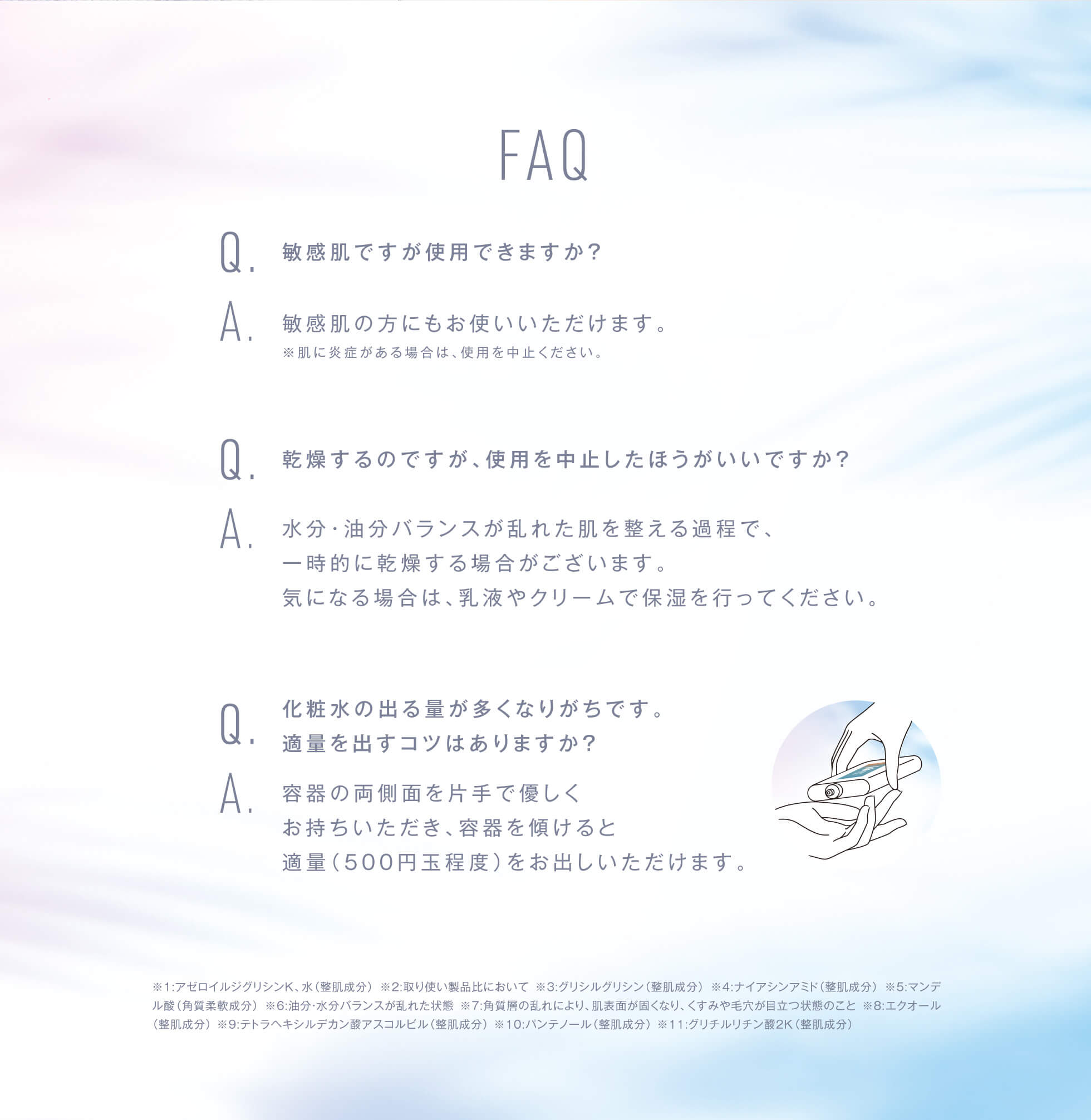 美容クリニックの最前線をホームケアに。 皮脂や毛穴トラブルが気になる肌に、3つのひきしめ成分と角質ケア成分を配合した化粧水です。高濃度※2アゼライン酸誘導体※1をはじめとする3つのひきしめ成分アゼライン酸誘導体※1、グリシルグリシン※3、ナイアシンアミド※4が肌の油分・水分のバランスを整えながら、肌をひきしめて、毛穴の目立ちにくいなめらかな肌へ整えます。マンデル酸※5が不要な角質に穏やかに働きかけ、ざらつきのない均一な美しい肌へと導きます。 ※1 アゼロイルジグリシンK、水(整肌成分)、※2 取り使い製品比において、※3 グリシルグリシン(整肌成分)、※4 ナイアシンアミド(整肌成分)、※5 マンデル酸(整肌成分) |